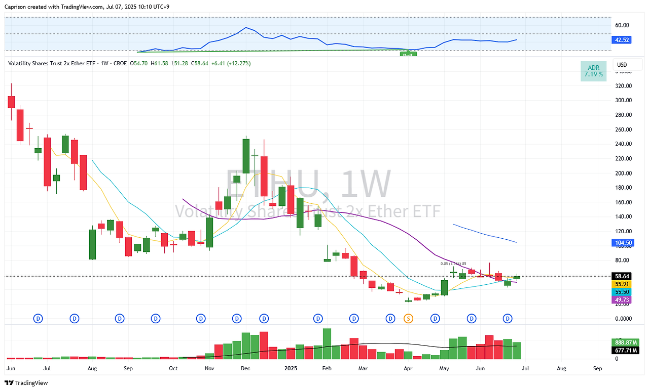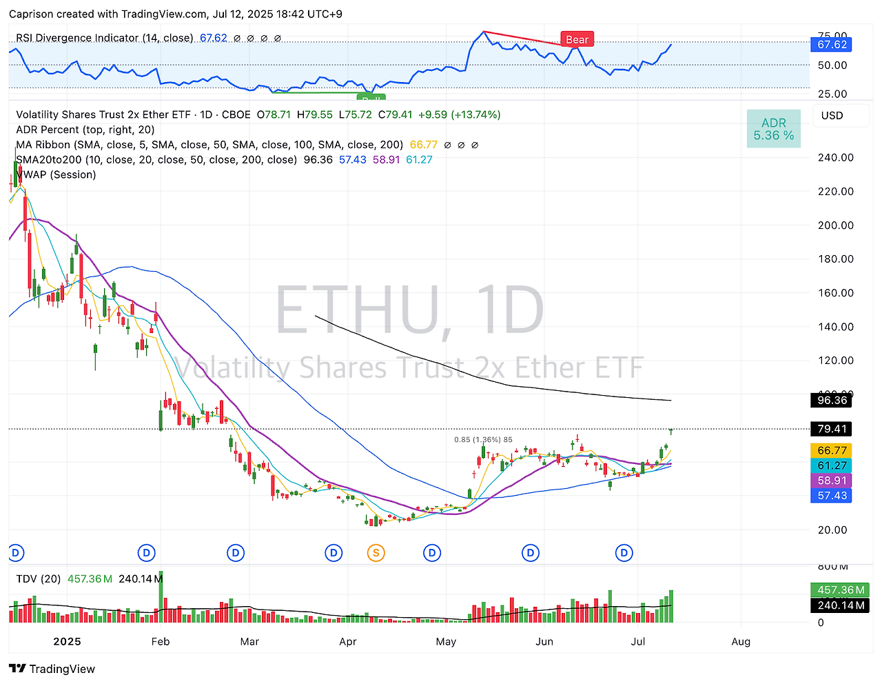 ETHU. 이더리움 2배 레버리지 추종 ETF임. 아마 알 사람은 다 아는 종목일텐데 우리나라 사람들이 순 매수 금액 10위권 안에 있음.