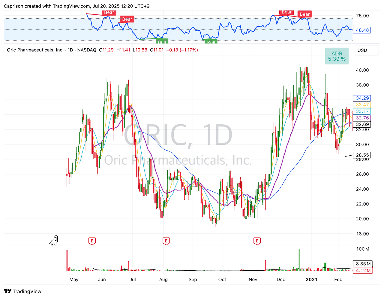 ORIC은 2020년 4월 $16에 IPO를 진행했고 장초부터 몇 주간 좋은 흐름을 보였었음. IPO에 참여했으면 바로 100% 수익이 가능했음.
