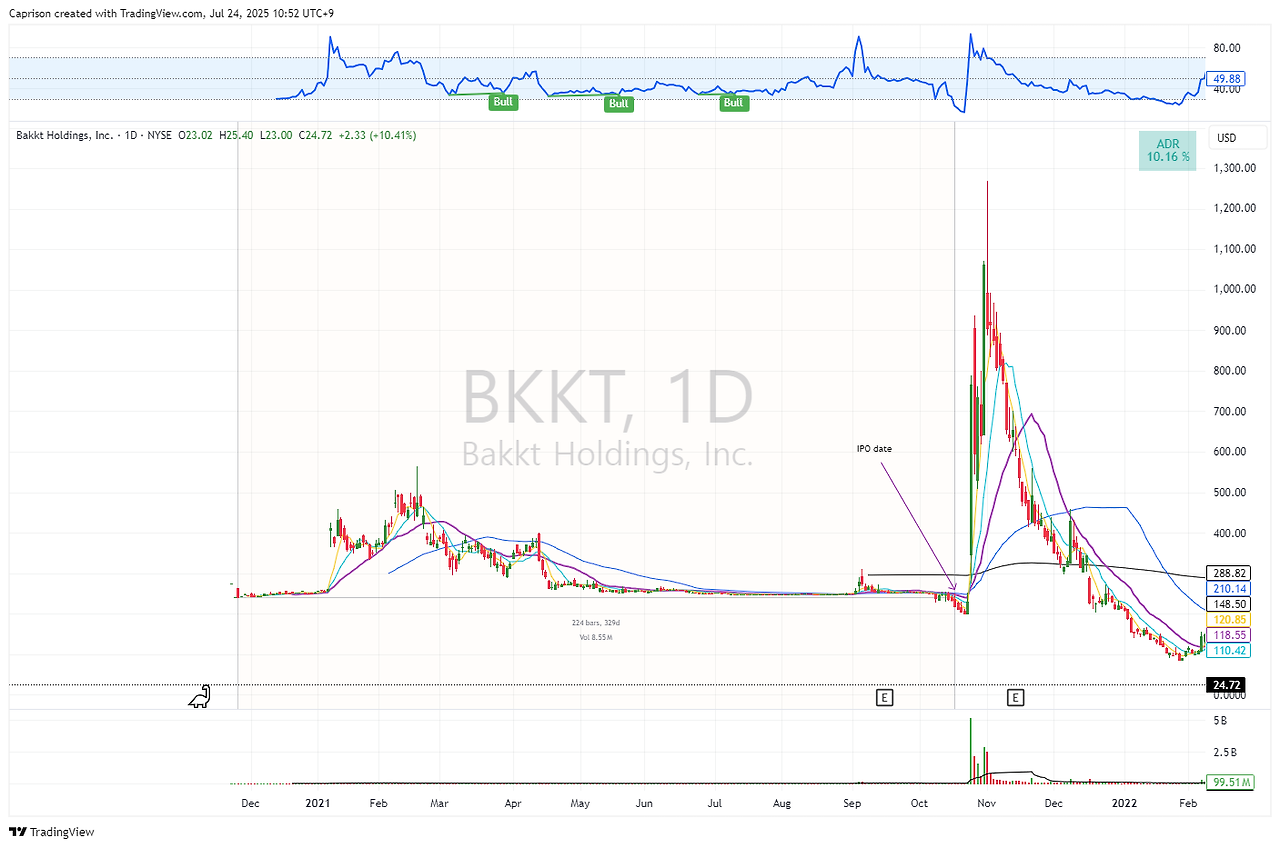 상장하고 40-50% 상승하고 액면가에서 반토막까지 떨어짐. 처음에는 그래도 매수세가 있어서 올라갔다가 오버행이 너무 컸는지 폭락해버림. 당시 SPY는 그냥 좁은 범위에서 기를 모으는 구간이어서 그냥 오버행 이슈였던 것 같음.